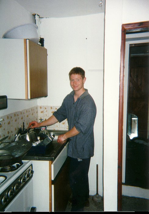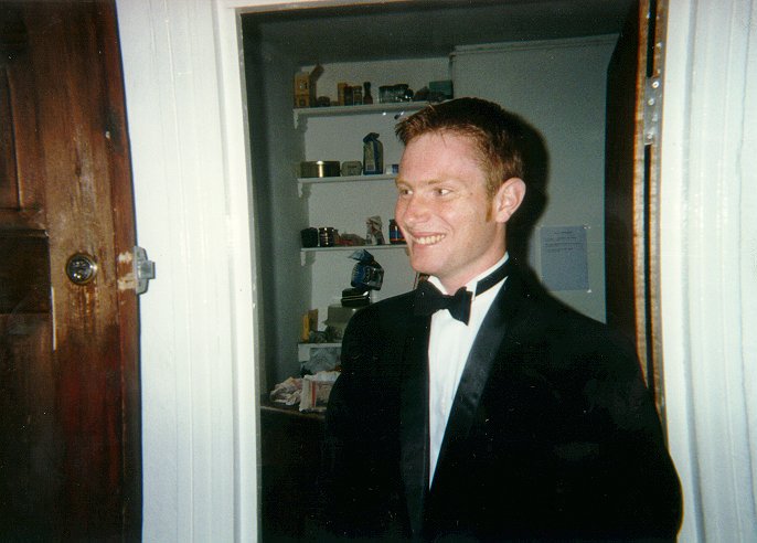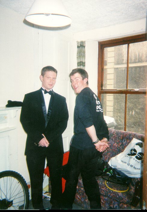 O.k. here we have James on the Left, looking rather smart, and heading off to the Summer Ball. And Charlie on the right... I personally think it is impossible to get pictures of Charlie doing anything normal, as you can see later on... The picture, by the way, was taken in our old front room, otherwise known as the "Bike Shed"...