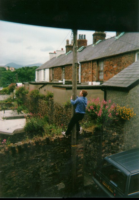 And there's James again, Climbing up the BT pole outside the house, on a top secret mission. Taken from my bedroom window.
