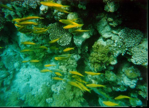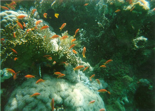 Some Anthis squamipinnis otherwise known as "Wreckfish". These small fish are found in huge numbers on all the reefs in the Red Sea; at Ras Mohammed you can swim through a shoal that must contain several thousand individuals! The species exhibits sexual dimorphism - i.e. the males and females look different, with the males being more colourful. They also change sex from time to time; when the male dies, the most dominant female will turn into a male. Also in the picture is one of the Tangs endemic to the Red Sea (dark blue with yellow fins). You can see a bubble coral and some fire coral as well.