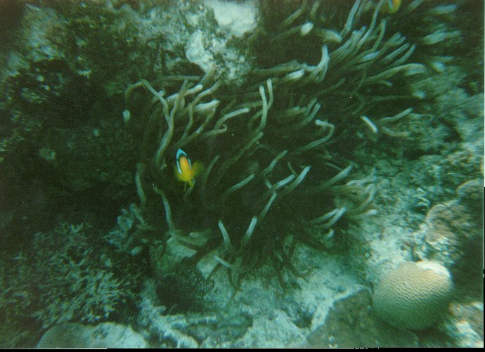 A Clownfish (Amphiprion sp.). Not a brilliant shot, but at least here it is. I'd quite happily take rolls of film of these fish, which are my absolute favourite. Notice the anemone it's living in; you don't find Clownfish without anemones, and on some reefs, you don't find anemones which don't have a Clownfish in residence either, because the anemones are sometimes eaten by Butterfly fish. The Clownfish drives them off - it will try to do the same to you if you get to close too! The Clownfish also gets protection from living in the anemone, as most other fish are stung to death by the nematocysts in the tentacles.