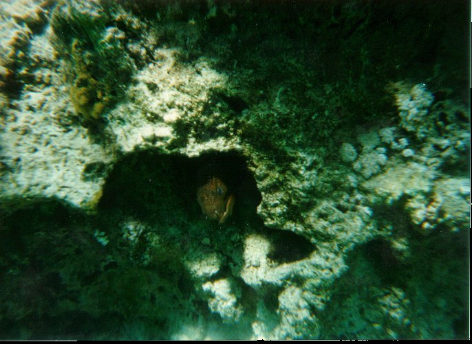 A Giant Moray Eel. This one is pretty big; the picture doesn't do it justice. Also, it's mostly hiding in its hole. Sometimes you can entice them out, but I didn't fancy risking my fingers...