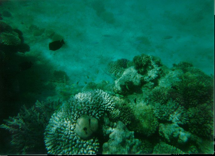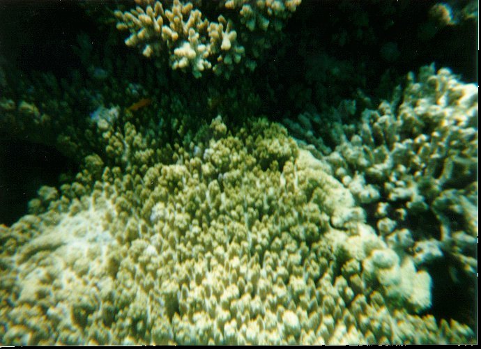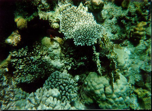 A nice picture showing various types of coral (Acropora and Fire Coral- Millepora sp. as well as a few other species). Also there, but very hard to see in the scanned image is a Coral Grouper.