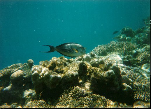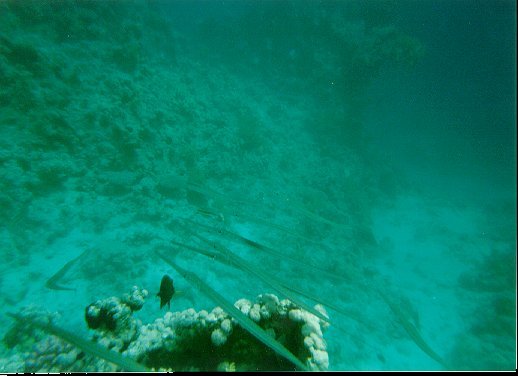 A school of Flutefish. This picture was taken at about 10m - the camera was probably not too impressed with the depth, only being rated to about 6! :) You can see the white coral sand that is found at the bottom of all reefs in this picture as well. Notice how the colours are bluish from the depth.