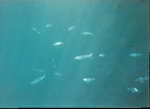 A Shoal of Fusiliers. This is another common species of fish found wherever you jump in, usually out in mid water. This picture was taken heading back from the reef to the boat - the cloudiness of the water is due to a plankton bloom.