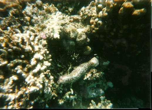 In the middle of the picture you can see a Sea Cucumber nestling in amongst the coral.