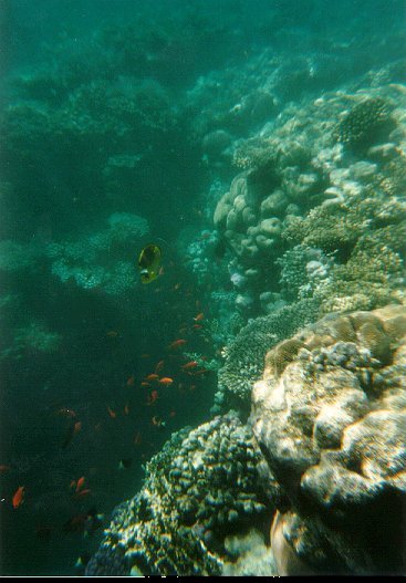"Panoramic" shot of the reef to show what it looks like as a whole. Notice the school of Anthias squamipinnis and the lone Butterfly fish (the bigger yellow and black one). Notice again how the water filters out colour with depth and distance with the background looking bluish.