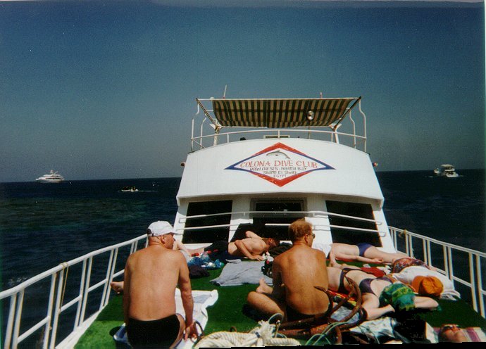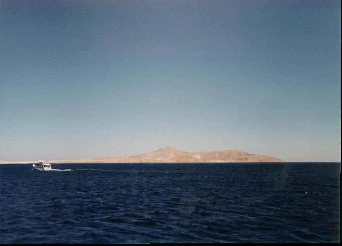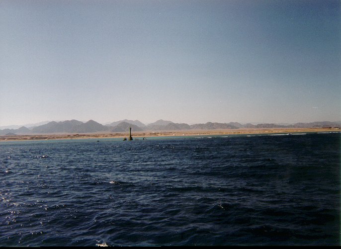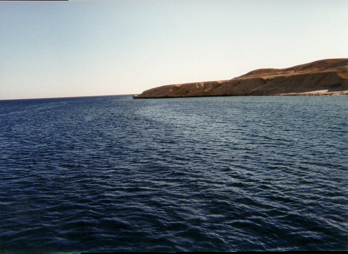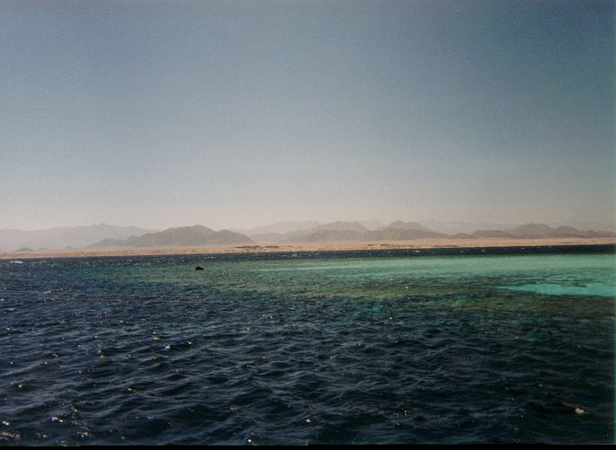 "Ooh isn't that nice..." As you can see the sea is a nice deep blue colour. The land is desert, part of the reason why the reefs in the red sea are so good - low rainfall means little silt gets into the water to damage the coral by smothering/cutting out light. I think this was taken in the Straits of Tiran. Look at the sky! No clouds :) Bliss!